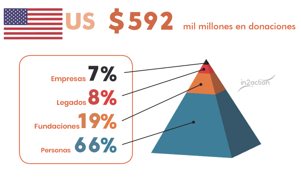 - Los individuos donaron US$ 392.45 mil millones de dólares, con un crecimiento del 8,2 % en dólares corrientes y del 5,1 % ajustado a la inflación, siendo las personas físicas la principal fuente de donaciones, representando el 66 % del total de contribuciones.