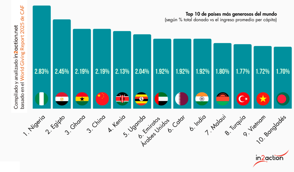 • Esto marca un giro: ya no hablamos solo de “quién dona más” en términos absolutos, sino de quién dona proporcionalmente más, algo que puede cambiar el mapa de los rankings tradicionales. Desde in2action, en nuestro informe anterior hicimos el ejercicio de comparar los montos anuales donados con el PBI per cápita de cada país.