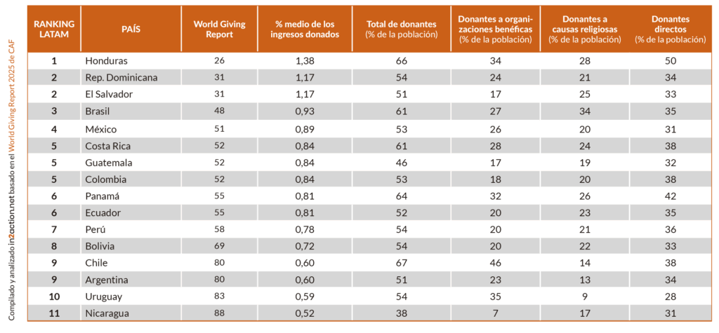• América Latina: una generosidad activa, pero informal: En el reporte se incluyen datos de 16 países de América Latina. En promedio, el 52 % de la población dijo haber donado dinero en 2024 por alguna de las tres vías relevadas (organizaciones, causas religiosas o directamente a personas). Pero las diferencias entre países —y entre los tipos de donación más comunes— son notables.